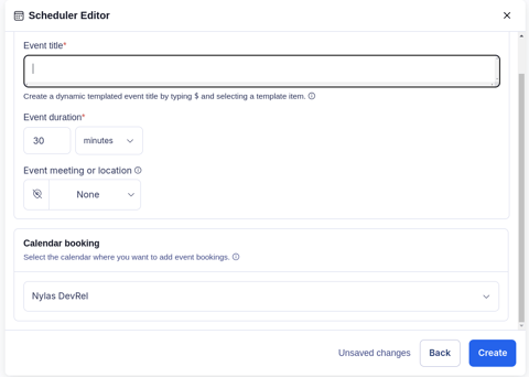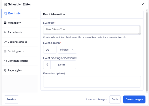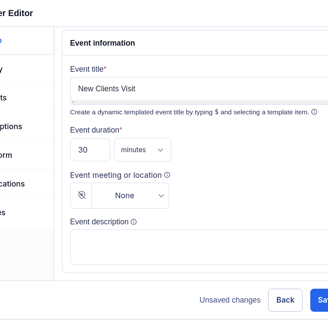 El Editor de eventos es un componente de la interfaz de usuario que te permite crear y gestionar eventos, los cuales pueden representar cualquier tipo de reunión con tus clientes.